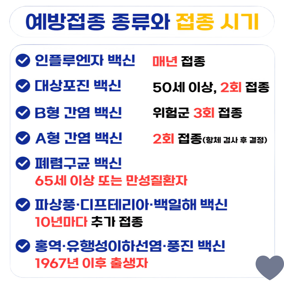✅ 40대 예방접종 꼭 챙기세요! 건강수명을 지키는 백신 정리40대 이후, 건강이 예전 같지 않다고 느껴지시나요?이 시기부터는 ‘예방’이 가장 좋은 치료입니다. 특히 예방접종은 나이 들수록 그 효과가 커지는 필수 건강 관리 방법인데요, 어떤 백신을 꼭 챙겨야 하는지 정리해드릴게요.💉 예방접종은 어린이만? 성인도 꼭 필요합니다많은 분들이 ‘백신은 어린이나 노약자만 맞는 것’이라 생각하시지만, 성인도 주기적으로 맞아야 하는 백신이 있습니다. 40대는 신체 면역력과 회복력이 서서히 저하되기 시작하는 시기로, 백신 하나가 치명적인 질병을 막아주는 생명줄이 될 수 있어요.💡 40대 이후 꼭 맞아야 할 예방접종 5가지 1. 독감(인플루엔자) 백신 매년 가을~겨울 필수 접종! 연 1회 접종, 고령자·..